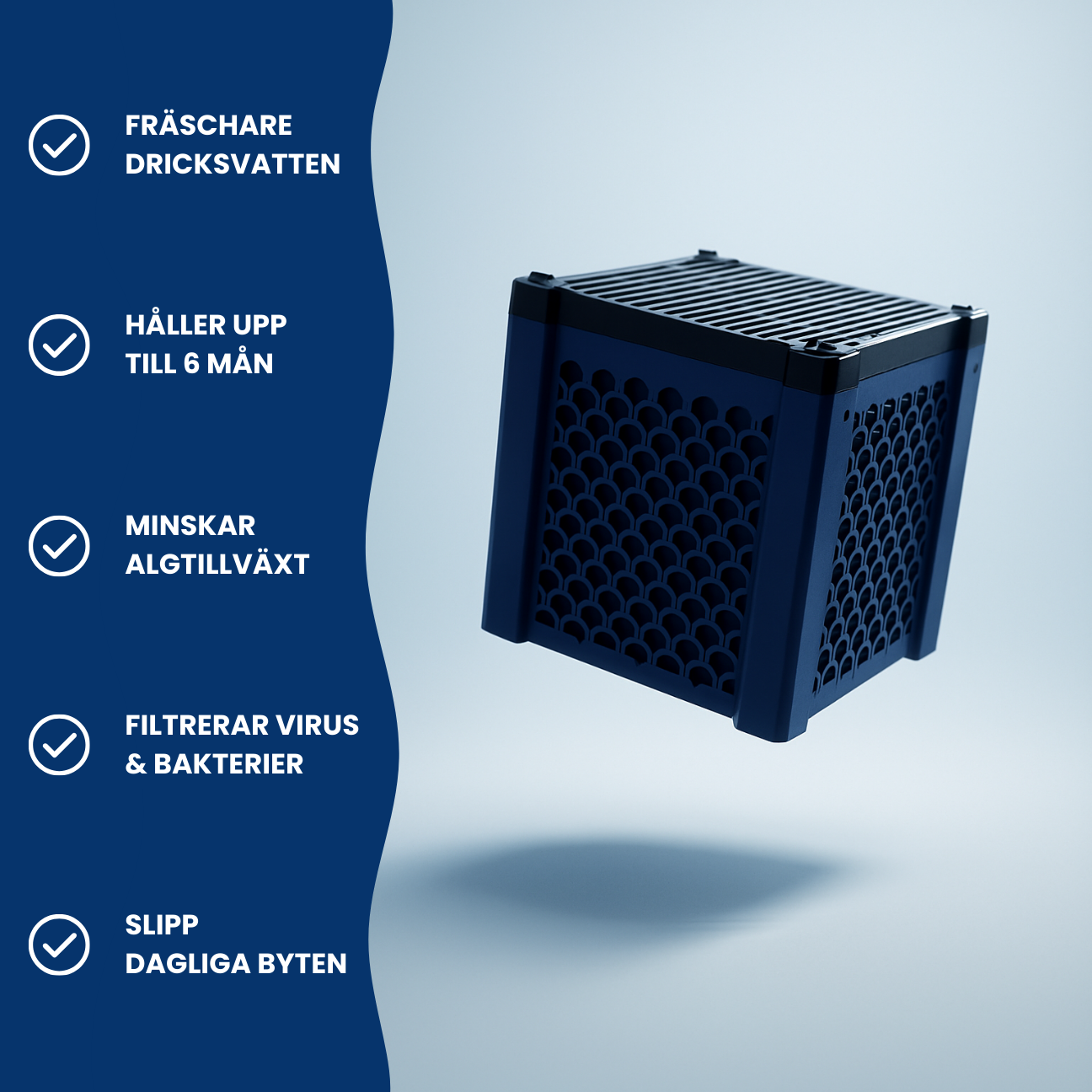 Freshcube anvÀnder aktivt kol frÄn naturliga material som binder bakterier, smuts och dÄlig lukt. Samtidigt fÄngar filterstrukturen upp skrÀp som annars skulle flyta i vattnet. Resultatet blir friskt och klart vatten som hÄller lÀngre.